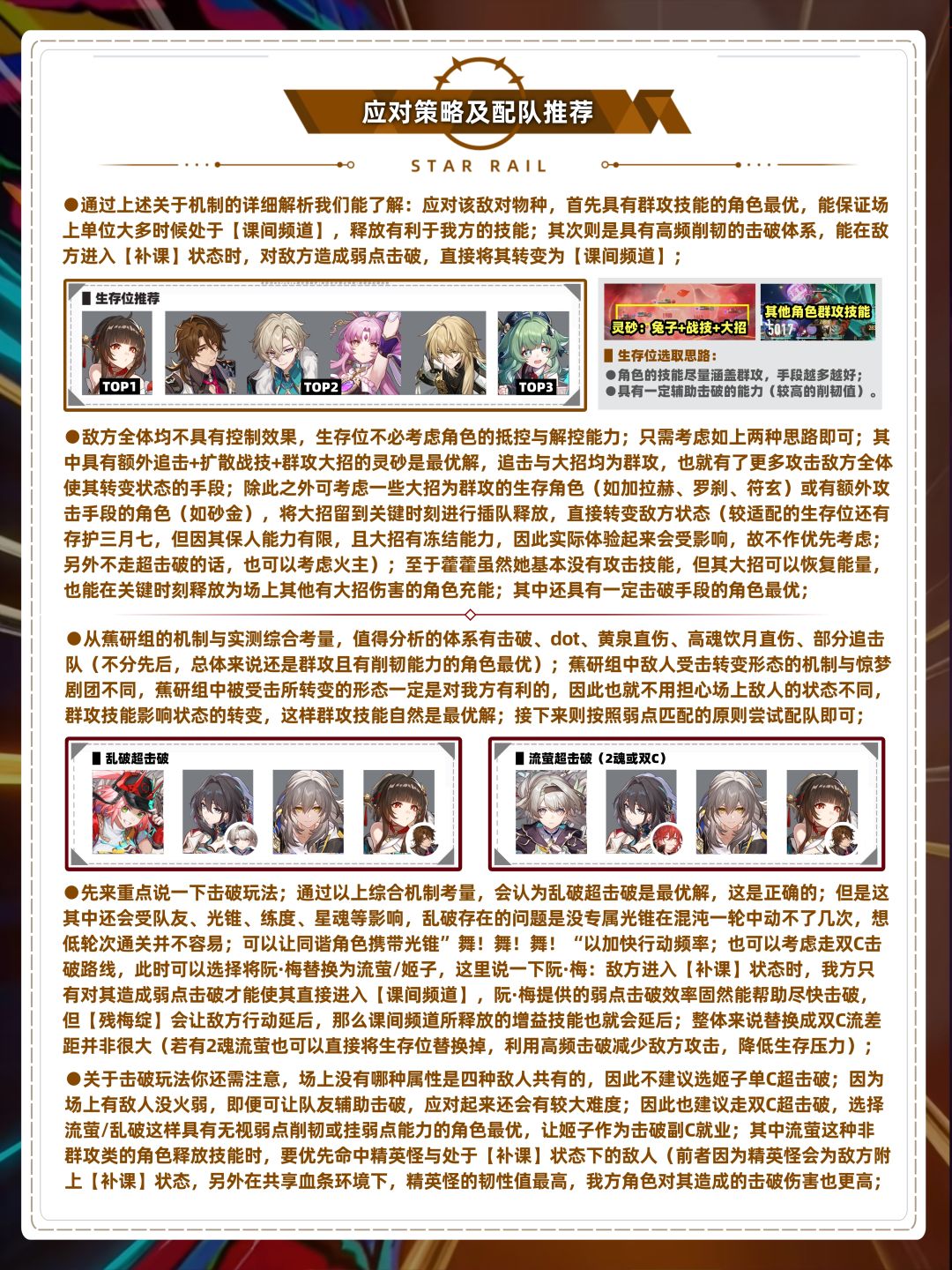 不同的地方是场上单位并非剧目那样的三个精英怪组成的扩散环境,而是由四名小怪+一名精英怪组成的群攻环境;由于敌方全体均具有受击转状态的机制(其中还特别存在被击破才会转变状态的附加机制),因此群攻类的击破体系应对起来最优(说白了其实就是乱破的专属boss,但黄泉队也能喝到汤);下面就让我们来细致分析一下。
