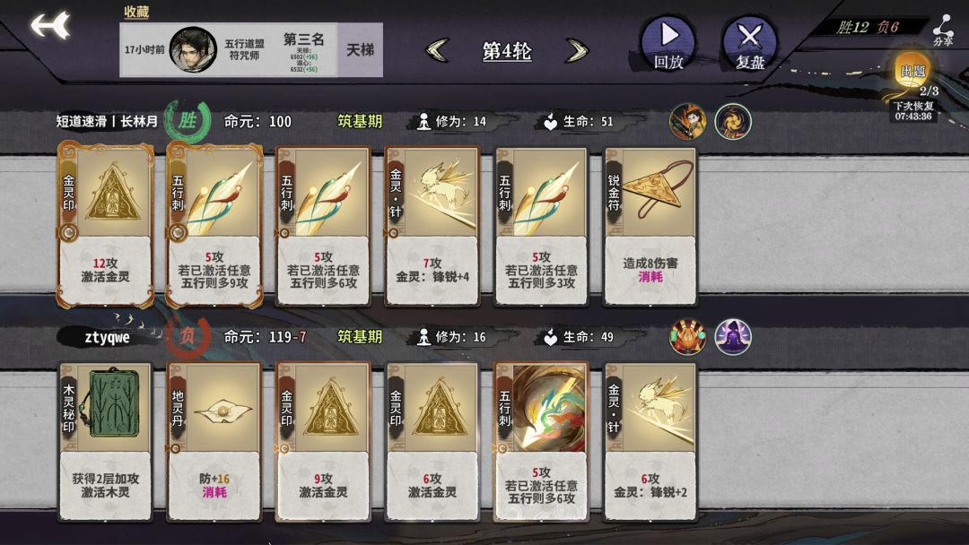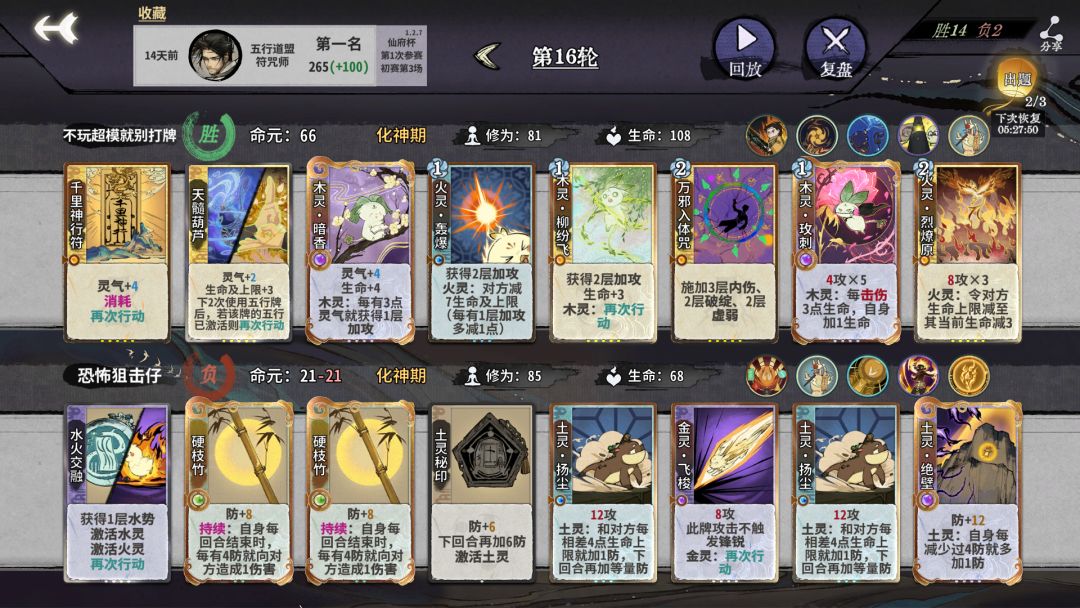 自仙府遗迹赛季开始后,本人就在努力尝试使用吾行之(下文简称男五)进行冲分。起初选择的副职为炼丹师,在75局70%前四率冲到六千分后,便开始漫长的瓶颈期,近期通过男五榜一赵郭侠的指导,改为选择符咒师进行上分,打出了12把3鸡10前四的战绩,顿感此套路之强度,遂作此经验帖,引导各位道友尝试并讨论。