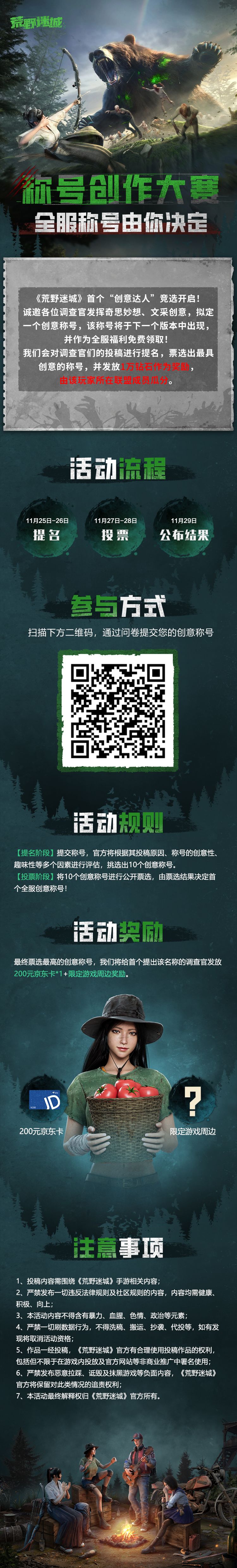 11月25日-11月26日,通过该问卷提交您所创作的“称号”,官方将根据其投稿原因、称号的创意性、趣味性等多个因素进行评估,挑选出10个创意称号。