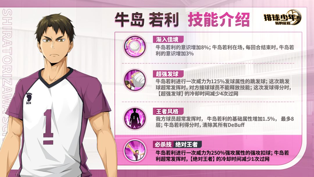 我方球员超常发挥时,牛岛若利的基础属性增加;牛岛若利得分时,清除其所有DeBuff。