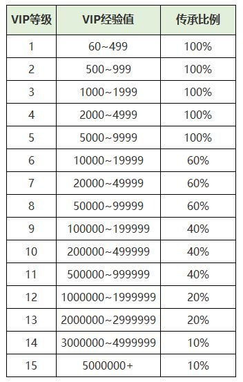 4. VIP经验传承比例:*每个VIP阶段获得的VIP经验都将以一定的比例的形式传承: