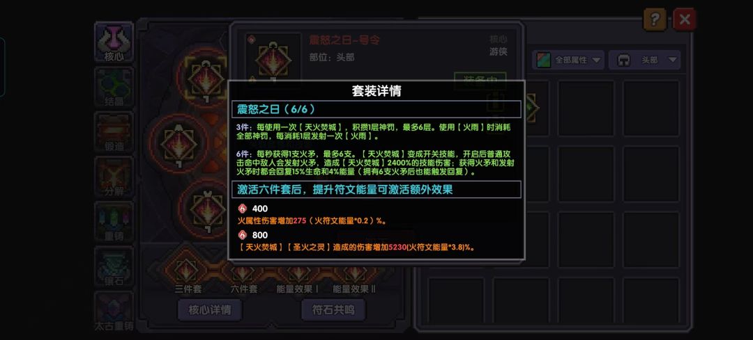 符文分为两种:大符文(见图1,核心符文)和小符文(见图2,结晶符文),大符文的组成有最上方白色字体的部位:六个大符文以此对应防具的六个部位。副属性:每个核心符文可以随机获得一条副属性,不同部位的核心符文可以获得的副属性词条也不同。头部和披风推荐暴伤,项链和戒指推荐首伤,前期暴击不够也可以戴暴击,胸部和脚部一定要符文能量。套装效果:六个部位镶嵌了一套的核心符文后可以激活套装效果,强化对应的魔女技能,当符文能量达到400和800时可以强化套装效果(见图4),尤其是符文能量达到800时的套装效果,这是我们输出质变的开端。小符文也分六个部位,每个部位可以从三种属性中选取一种生效,不同部位可以选取的属性不同。头部推荐活力,披风推荐元素魔力,暴击不够就专注,胸部推荐你所克制属性的抗性(火用木抗),脚部推荐力量,打大秘境可以换破盾,戒指推荐元素魔力或者穿甲,项链推荐致命或者穿甲。