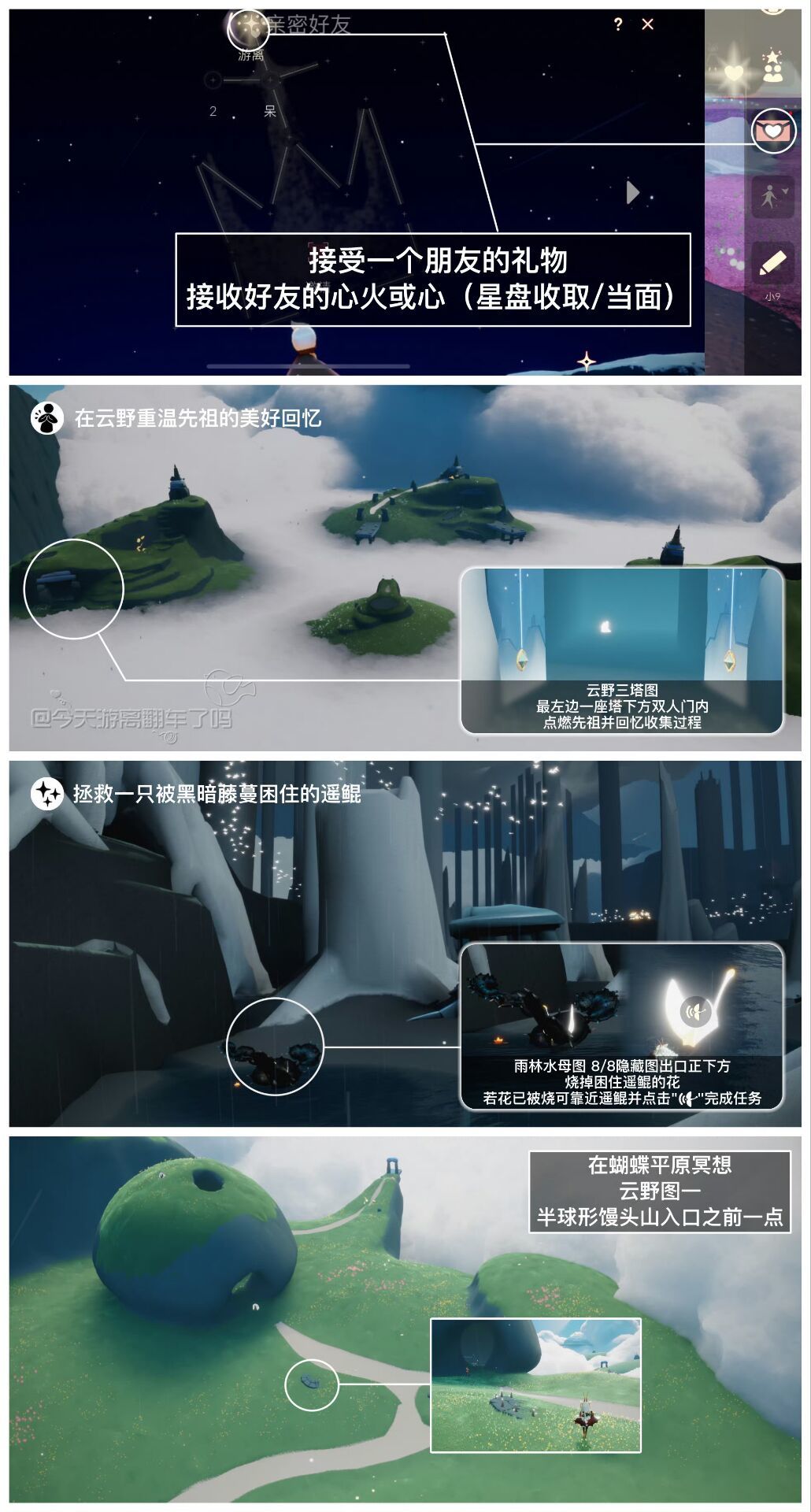 《光遇》游戏中每天的每日任务及大蜡烛的位置都不相同,玩家完成每日任务及收集大蜡烛都可以得到丰厚的兑换奖励,奖励可以用于兑换各种动作及道具,不过很多小伙伴不知道每日任务怎么做,又懒得自己去找大蜡烛的位置,我们汇总了每日任务的完成攻略以及蜡烛位置,一起来看看吧!