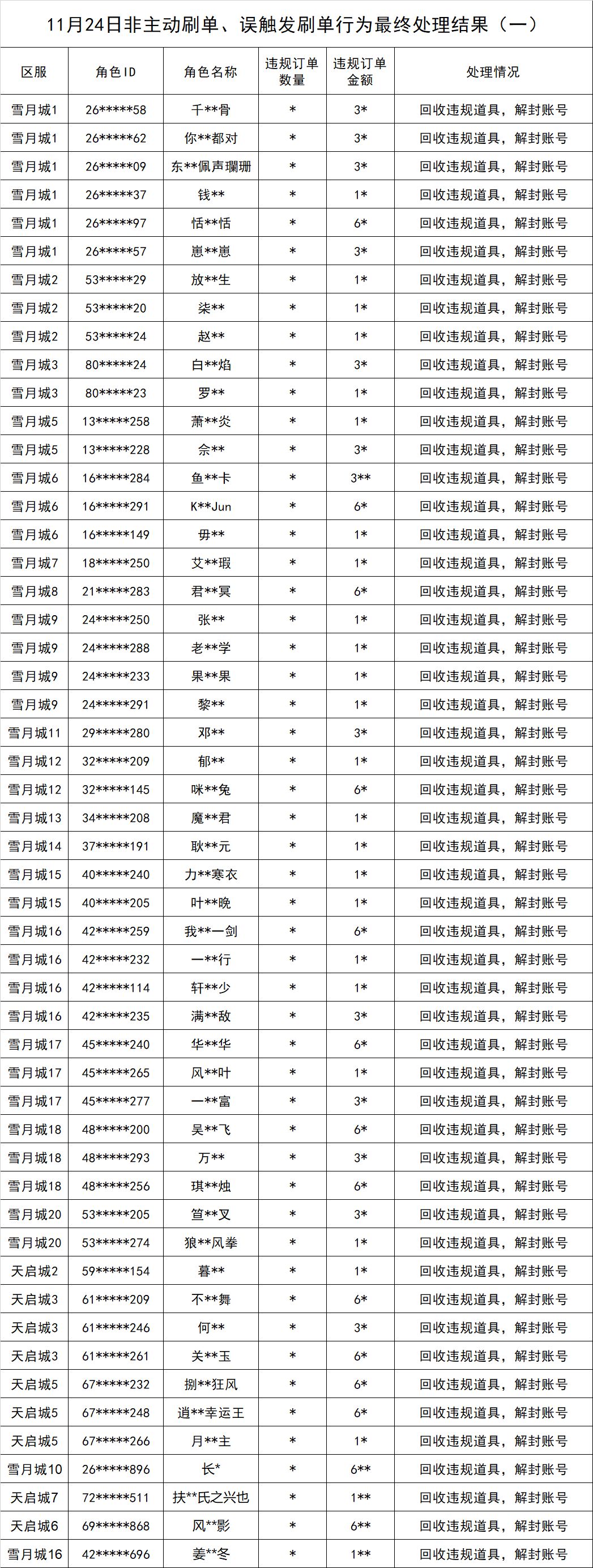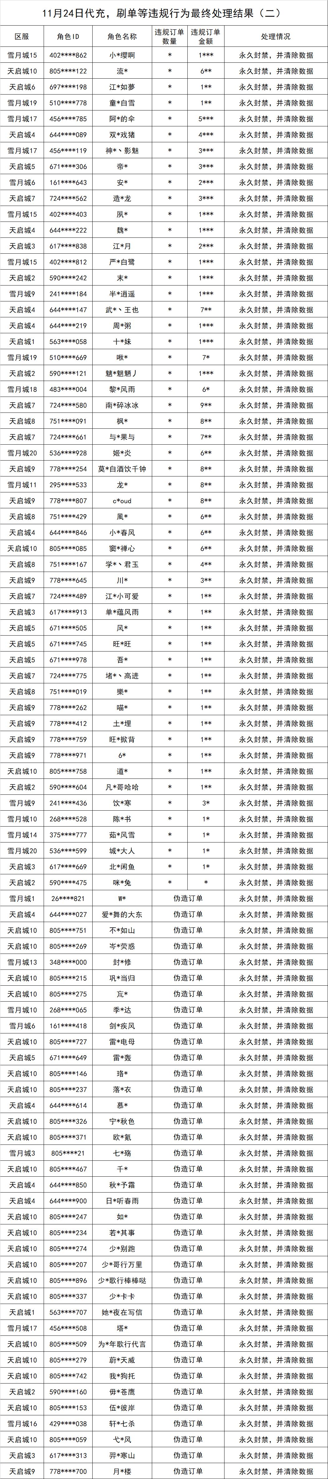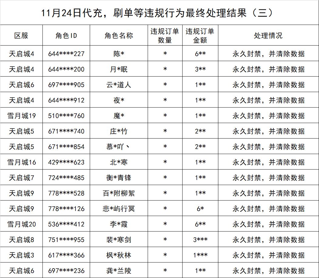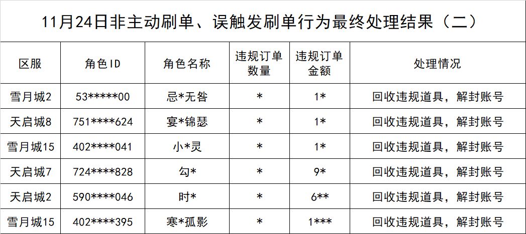 官方公告丨11月24日代充,刷单等违规行为最终处理结果公示