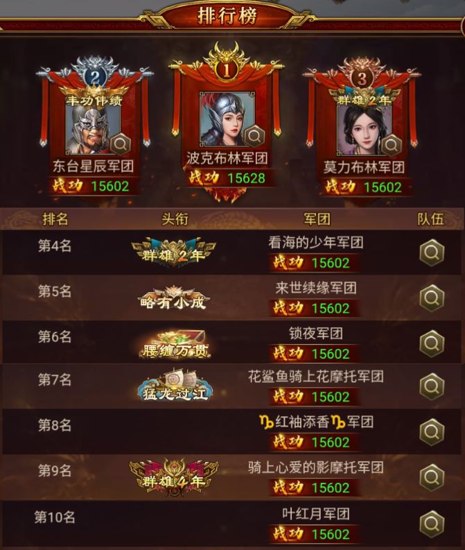 以 15602 战功赢得第二位的是 东台星辰 军团!