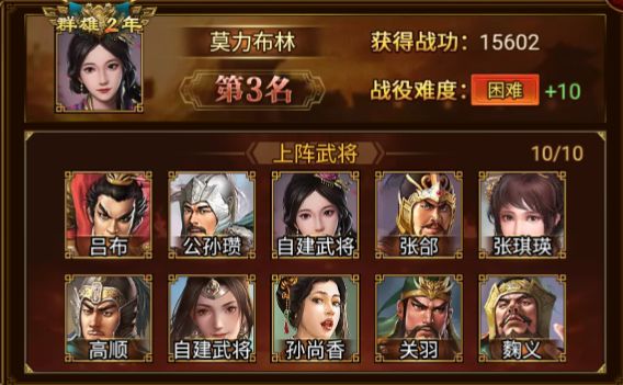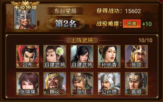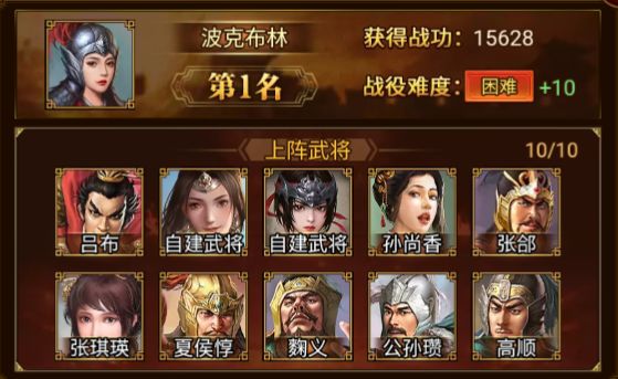 吕布、公孙瓒、张郃、张琪瑛、高顺、孙尚香、关羽、麴义、自建武将*2