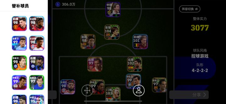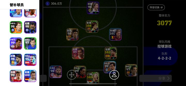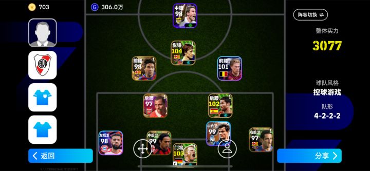 hello hello小伙伴们,我是一名实况足球0氪玩家,现在阵容如图所示。每天所有基础任务拉满这是必须的,另外刚开始新手玩家阵容不行操作不行踢不了手动天梯的话,一定要踢教练天梯,奖励很丰富。还有两个获得奖励的渠道,一个是tap活动一个是大神各种签到活动,只要你把这两个活动做好,每个月多几百金币没问题,另外tap的签到活动非常好,十连券大大滴有。微信关注实况足球公众号,签到拿积分也可以换金币。慢慢发掘获得道具培养自己的球星,这种乐趣不是氪金能代替的。