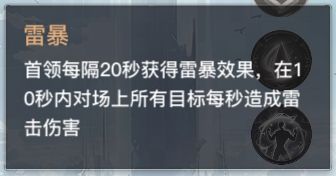 3、雷暴:首领每隔20秒获得雷暴效果,在10秒内对场上所有目标每秒造成多次雷击伤害。