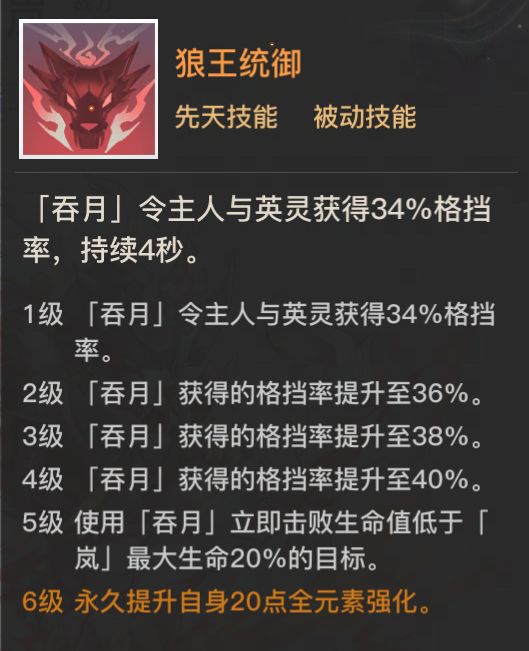 虽然它作为一名坦克英灵,并不能直接提高通关成绩,但岚与本周的词缀拥有非常好的契合度。首先是岚的格挡特性,岚的狼王统御被动可以大量提高全体英灵的格挡率,可以利用火附之盾词缀造成大量伤害。