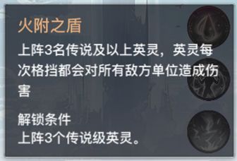 1、火附之盾:上阵3名传说及以上英灵,英灵每次格挡都会对所有敌方单位造成伤害。