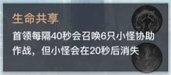 2、生命共享:首领每隔40秒会召唤6只小怪协助作战,但小怪会在20秒后消失。
