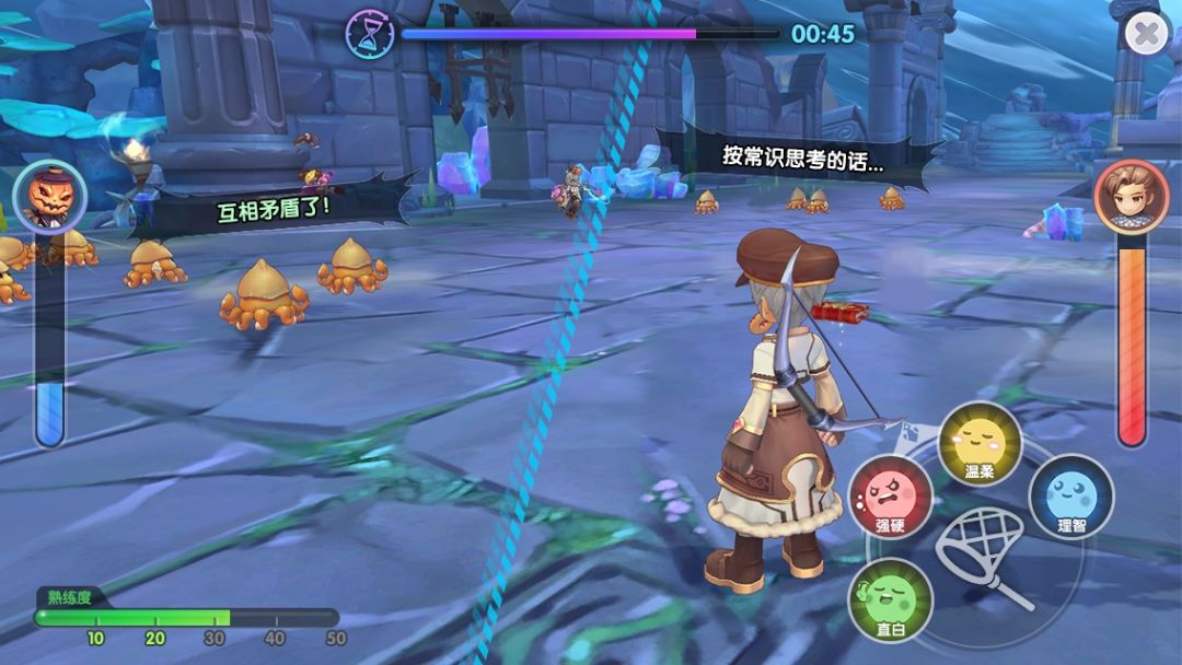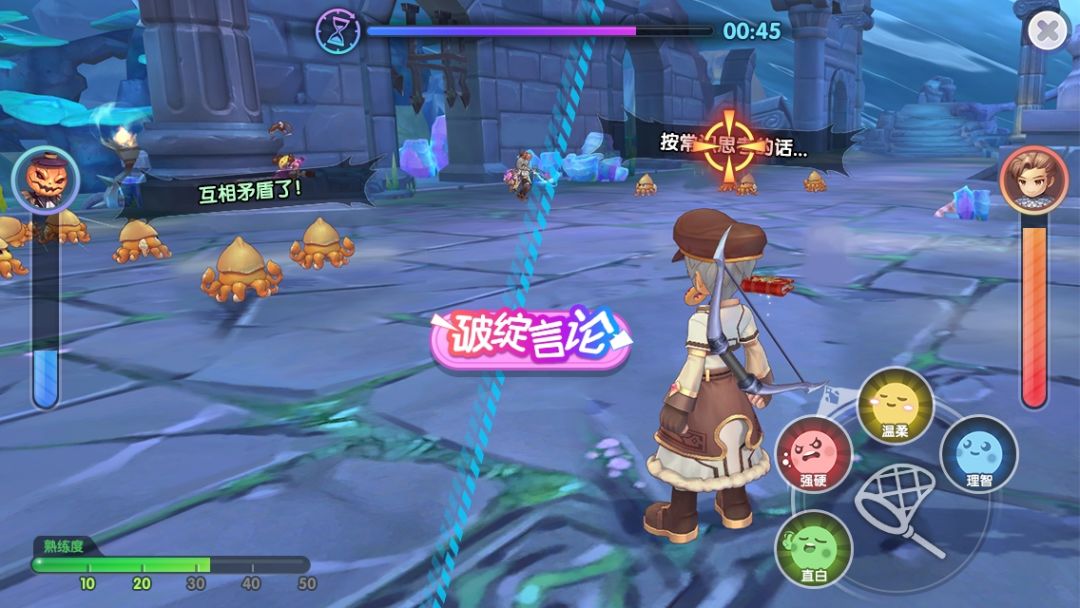 此时,冒险者需要根据怪物宠物的言论内容,在准星调整至瞄准怪物宠物言论后,点击相应的态度按钮(如直白、强硬、温柔、理智等),精准击破这些言论。需要注意的是,态度按钮具有冷却时间,点击任一按钮后,所有态度按钮在一定时间内无法再次使用。