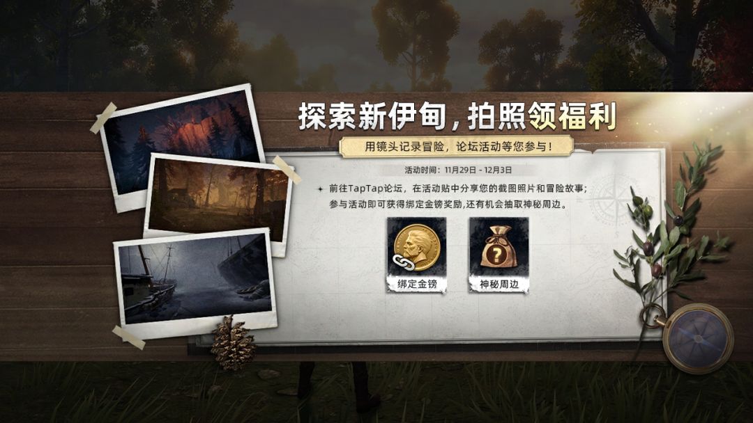 活动简介:用镜头记录冒险,前往TapTap论坛分享截图和冒险故事。参与活动即可获得绑定金镑奖励,还有机会赢取实物周边!