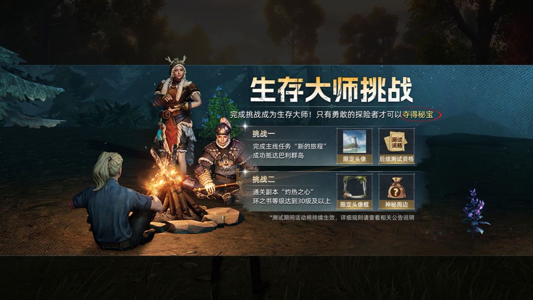 活动简介:完成挑战成为生存大师!只有最勇敢的探险者才可以夺得秘宝!
