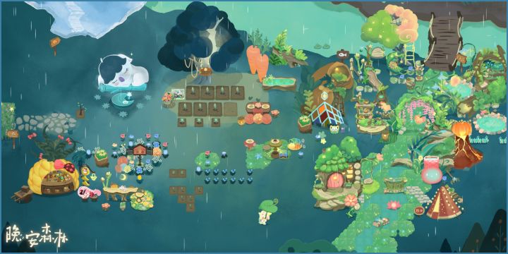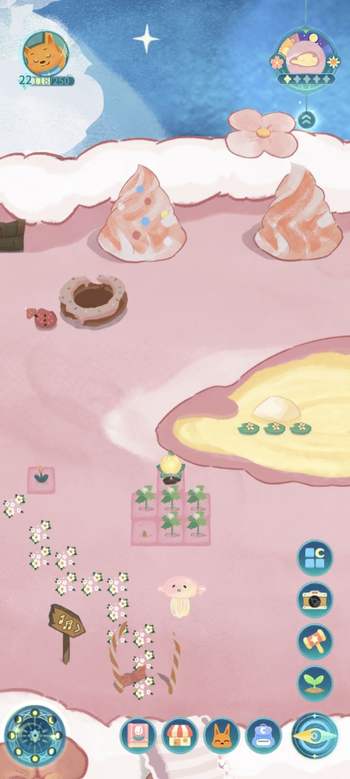 咳咳,因为概率和种子数量,大南瓜和大草莓还没种出来,说起大西瓜,真的很惊喜的,当时就是随手一种,刚好有4颗种子种在了一起,组了一手2*2的正方形,第二天这个位置就长出了一个奇怪的家伙,嚯,西瓜游泳池!(右下粉色)太可爱了吧嘿嘿