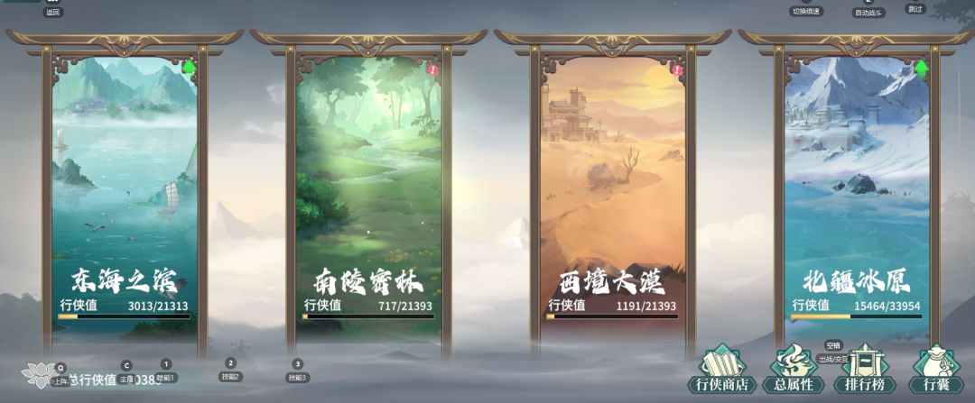 如上图示,行侠录一共有四张地图,第四张地图【北疆冰原】需要前三张地图的行侠值都达到1500分才能解锁。