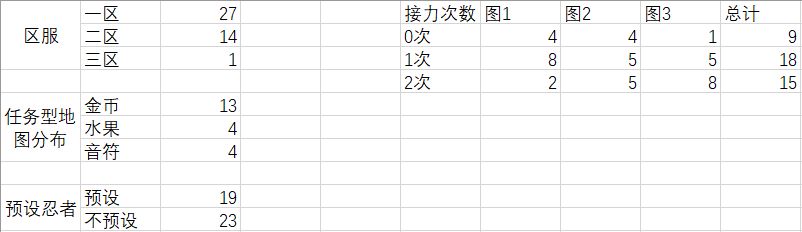 42位地图作者中,1、2、3服玩家的数量分别为27、14、1,与S1相比(27、9),二服玩家占比上升,三区开服时间较晚,仅有一位作者的地图入选(oo永远爱幽灵,14周图2)。有两位一服作者入选两张地图(她说风乎有点帅,七载凝凝霜ഒ)。21张收集地图中,13张为金币,4张为水果,4张为音符,相比S1(12,5,1),音符地图这个偏冷门赛道入选占比明显上升。本次数据分析还统计了预设忍者与接力次数情况。预设忍者地图19张,不预设忍者地图23张,几乎是五五开的局面,虽然S1没有统计,但预设忍者占比大概是上升的。接力次数方面,不允许接力的地图偏少,允许接力1次与允许接力2次的地图数量相仿,且存在这种趋势:地图长度越长,地图作者越倾向于给出较多的接力次数。