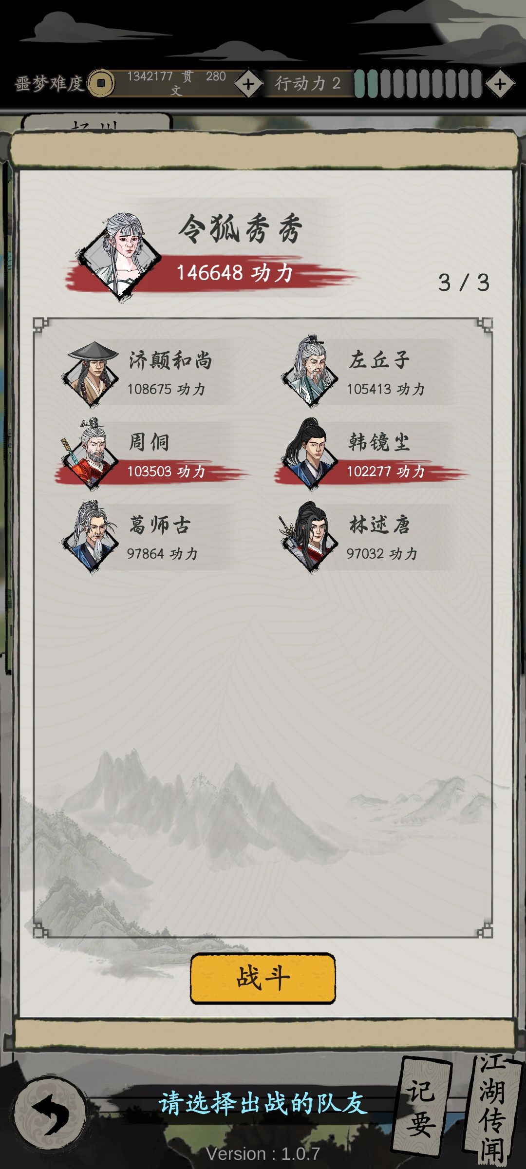 周彤和济公是强烈推荐的 能挂群体debuff,韩镜尘葛师古左秋子肉盾 另外一个随便选,我选了林述唐 惊鸿一剑偶尔能爆发