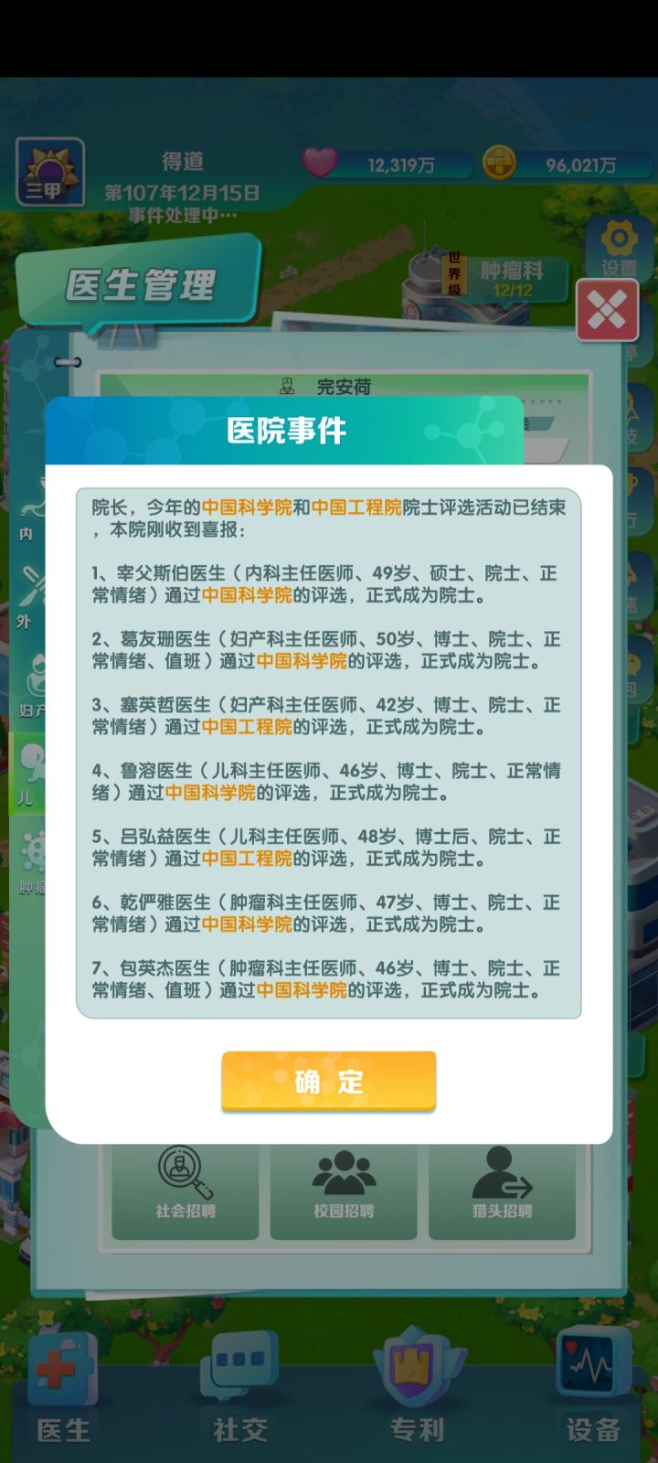 知道变成大款的爽点在哪儿不?就是不用看广啦!我这一把把的院士让我知道,原来院士是要运作的,有我这样的院长真是他们的福气,哈哈哈哈哈哈,第一次才升了两级就破产了,第二次玩了两天一把成功!我想说,这和老版的比有几个优化的地方,一是多了护理,二是多了排班,三是培训都是一次结束,不会每个人都要培训10次,反复花钱反复退休。看不到自己真实利润有多少,但肯定超8千万了吧。但是我认为第二点从策略来说是多于的,这属于下一层问题,不需要院长来考虑,太细节。以及,我认为事件太多太密,完全无必要根本点都点不过来,有点影响体验。