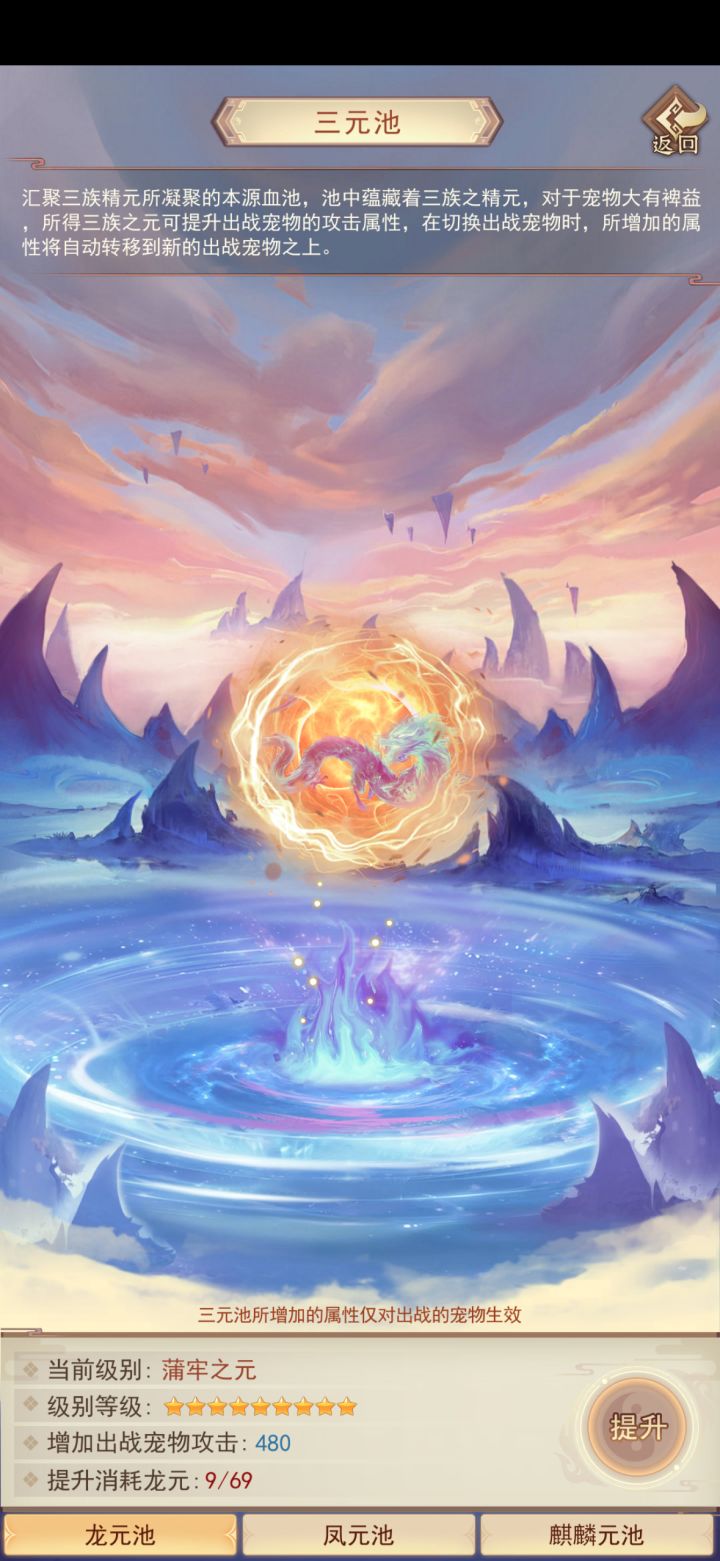 (3)三元池:三种妖力的使用之处,提升池子可提升当前出战宠物的攻击。