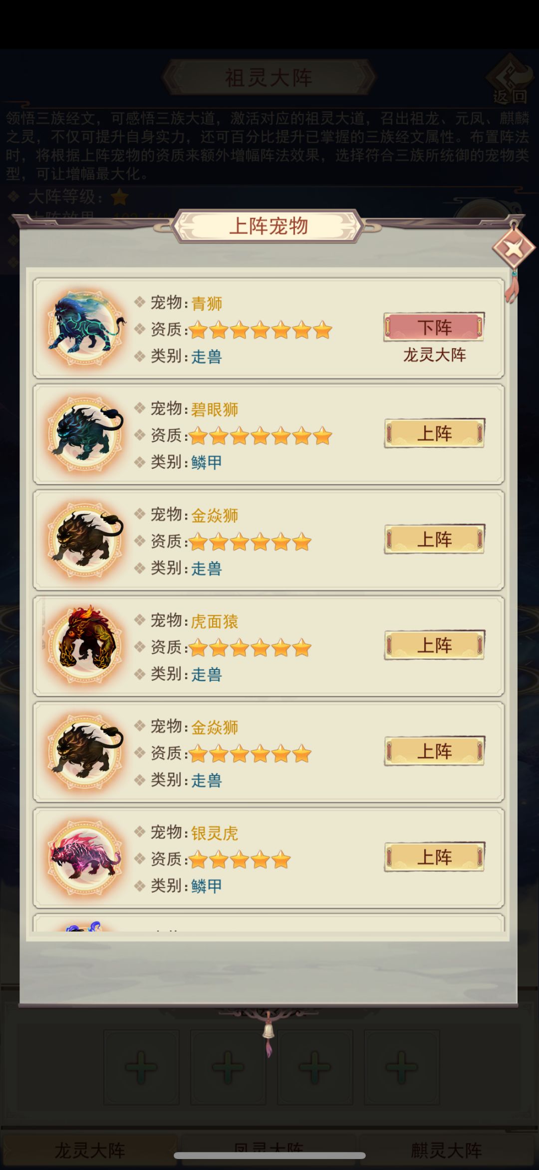 (4)祖灵大阵:三妖阵,属性提升,百分比增强三碑经文属性。激活方式:上阵宠物(最多八只,大阵的效果与宠物资质挂钩,建议留存5星以上宠物,四万年了没见到一只8星)。阵灵:经文增幅