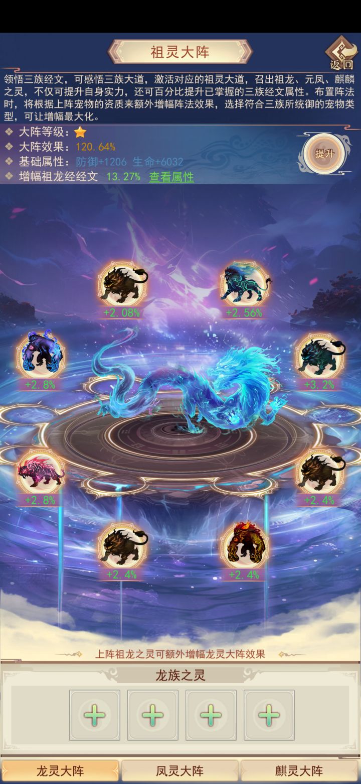 后续:开阵后所有三妖气都是领悟碑文,领悟满可以选择复苏完9个图腾(属性攻防血),也可以先升阵(百分比加成)。按照探索给的龙晶丰富度,龙晶不会缺,能一次性点满。凤麒麟同理。