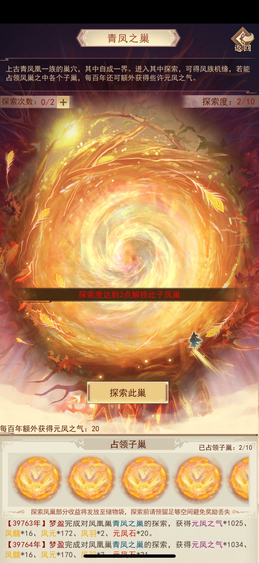 (1)每天可探索凤凰巢获得“元凤之气”,凤族信物额外探索一次,宝库购买