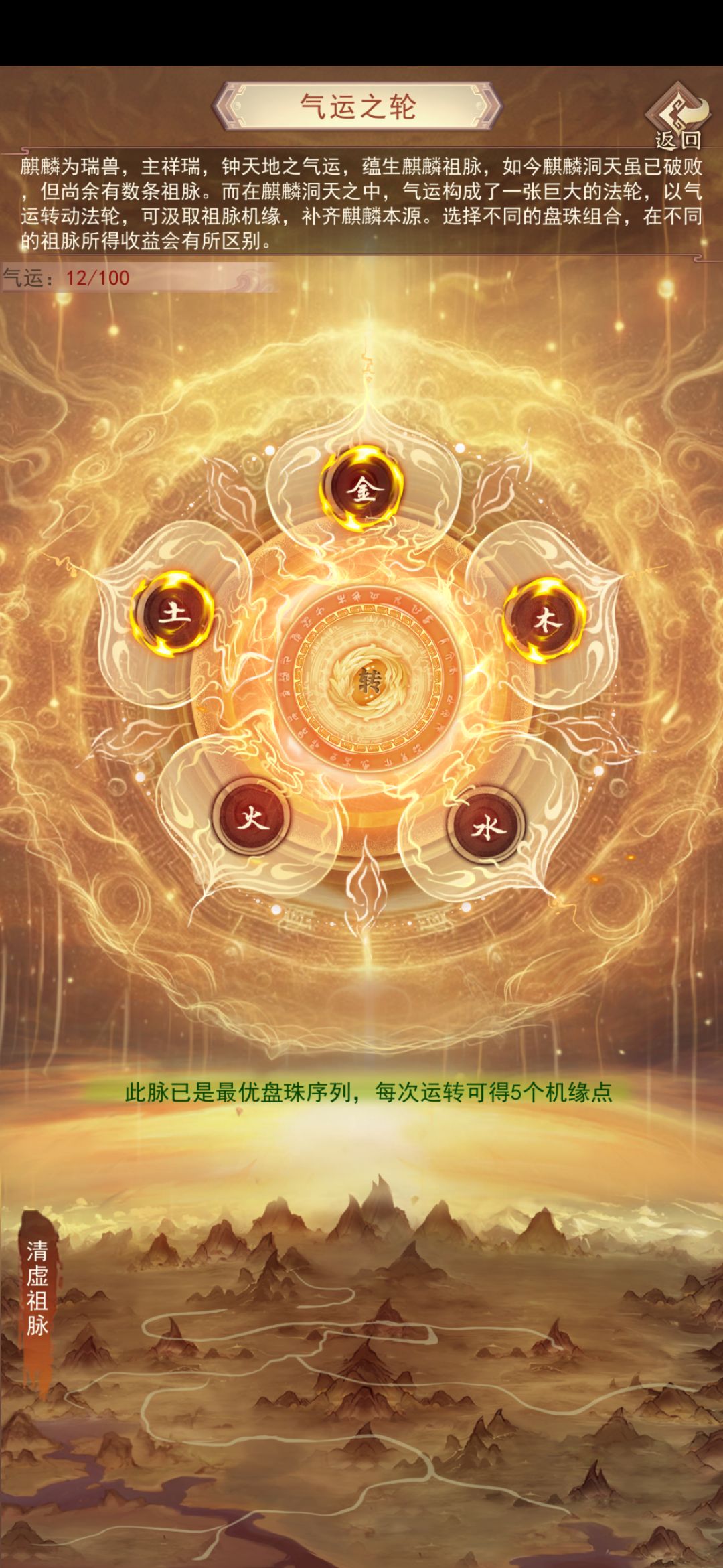 主要玩法:每天会刷新一个麒麟祖脉,祖脉有三档盘珠组合,关乎机缘的丰富(1档>2>3)。盘珠:气运轮上五属性珠子,每次转动选择三颗,每条祖脉的最优三珠组合为: