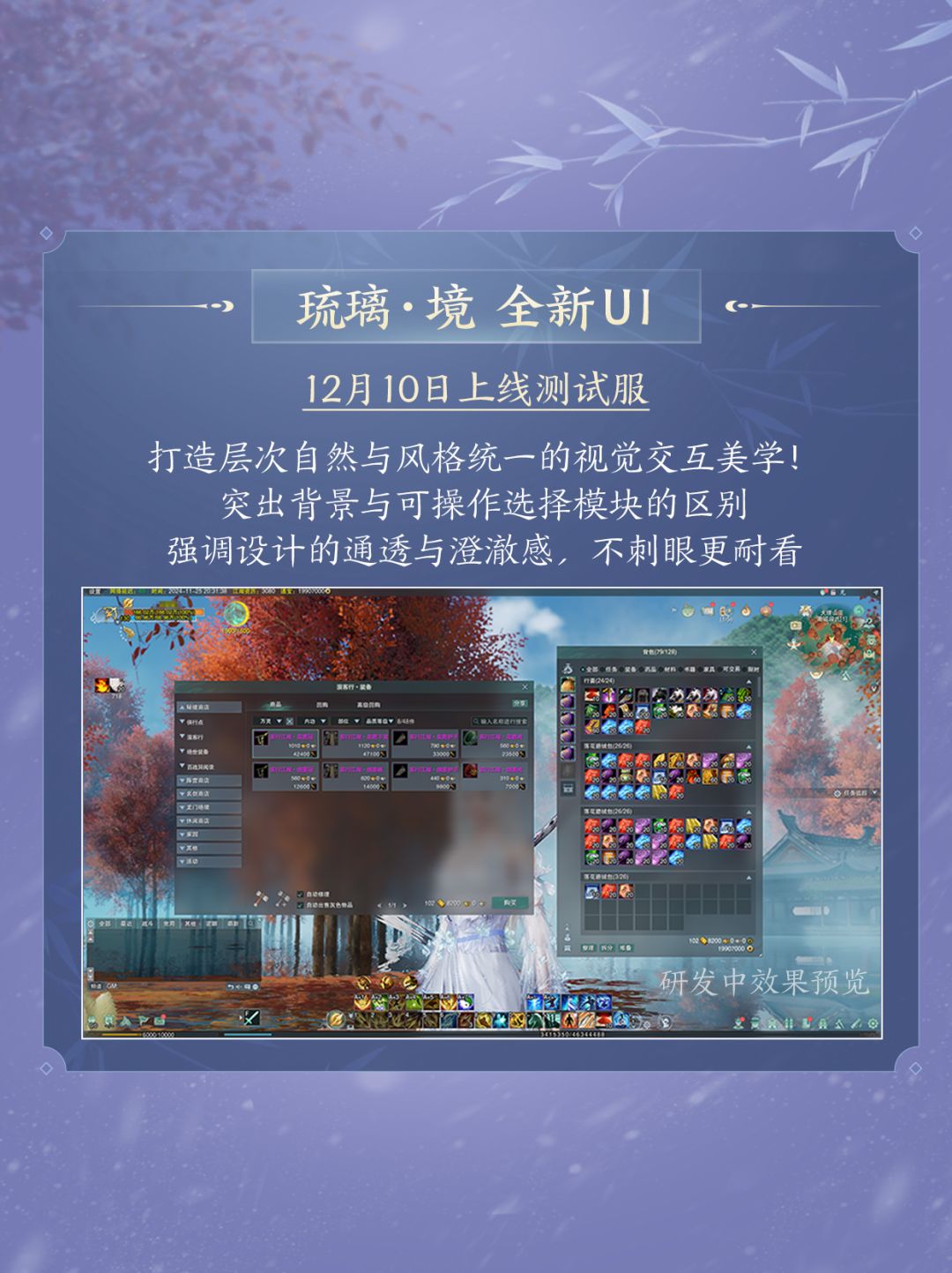 虚空无处所,仿佛似琉璃。焕新后的全新UI“琉璃·境”将在12月10日率先登场测试服,并于12月23日正式上线!突出背景与可操作选择模块的区别,更加通透澄澈,为侠士带来更舒适的视觉交互感受。