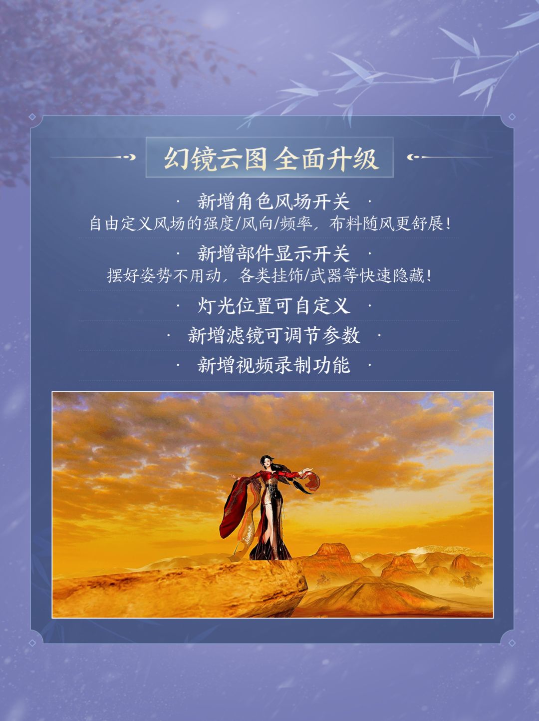 随风而动,风姿自然!幻镜云图新增角色风场开关,风向风速自由定义!镜头面前不仅可以快速隐藏部件,还有打光与显卡参数自由调整、视频录制等新功能,截出心仪美图更方便!