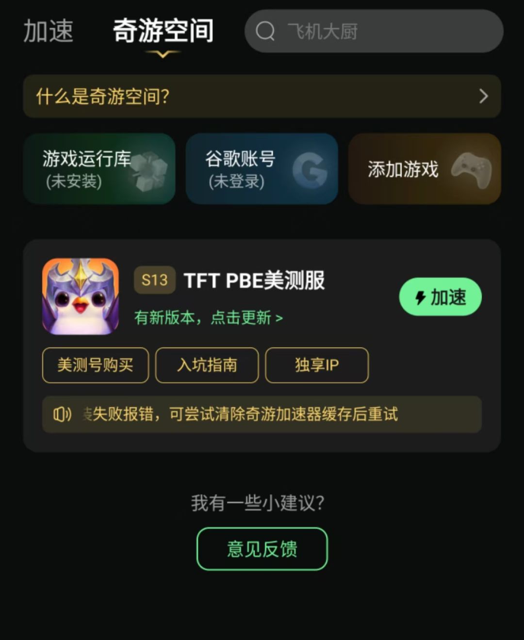 第三步:在【奇游空间】内先安装【游戏运行库】再选择添加游戏找到【TFT PBE美测服】点击下载