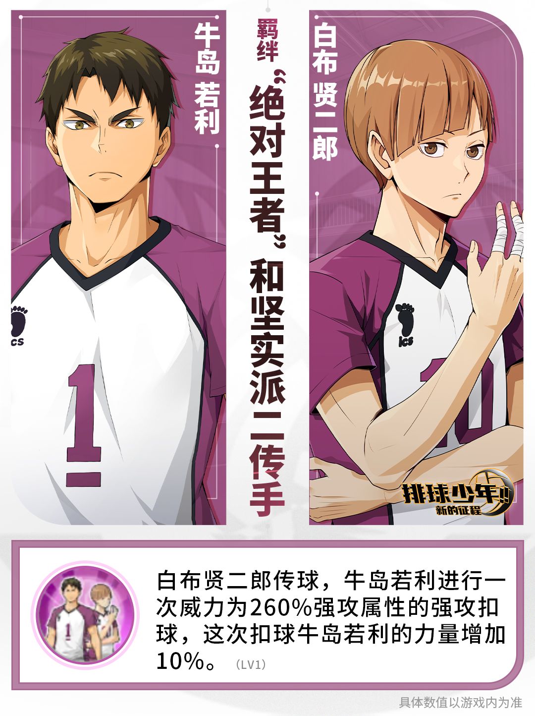 羁绊生效时,白布贤二郎传球,牛岛若利进行一次强攻属性的强攻扣球,这次扣球牛岛若利力量增加。