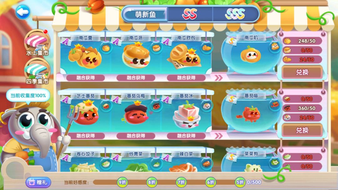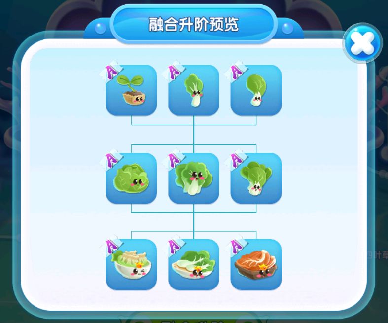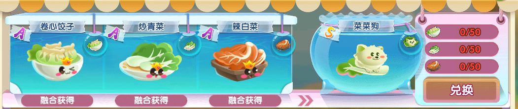 最后来到白菜鱼蛋的兑换路线,A级卷心菜苗、白菜叶、青菜叶进行融合升阶为A级卷心菜、白菜、青菜萌鱼,全部集齐后再进行融合升阶成A级卷心饺子、炒青菜、辣白菜。