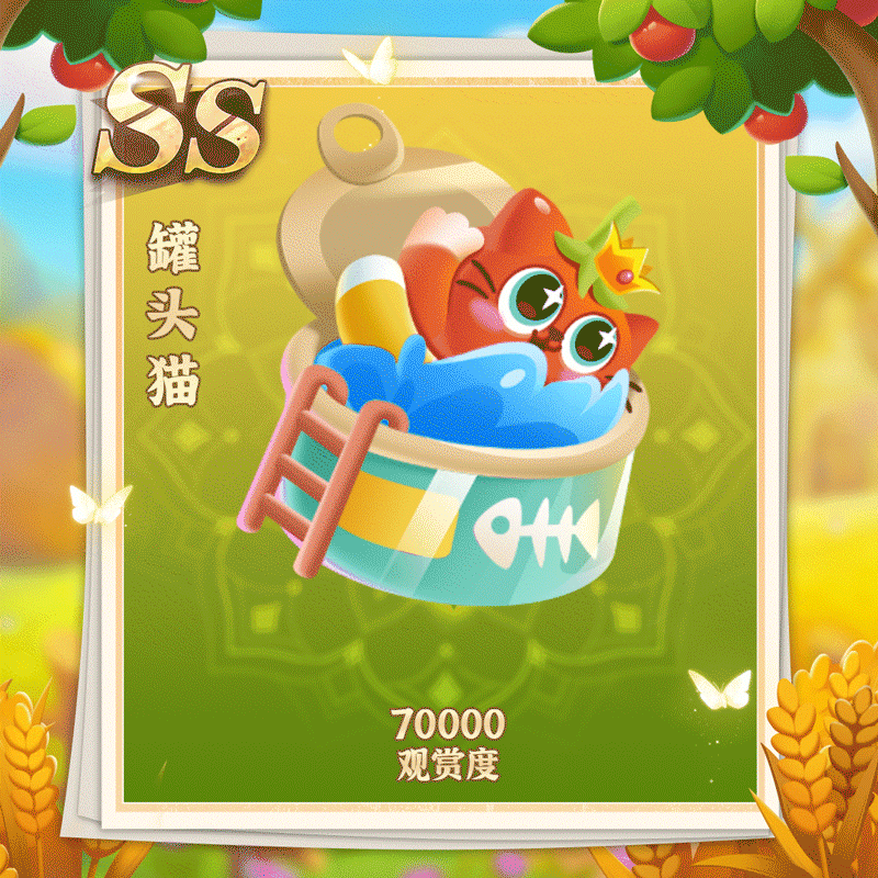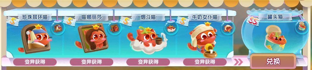 番茄喵可变异获得S级珍珠耳环喵、喵娜丽莎、烟斗喵、牛奶女仆喵,接着就可以用它们的鱼宝兑换出SS级罐头猫萌鱼哦~
