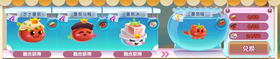 接下来就是番茄鱼蛋的兑换路线啦,A级番茄苗、番茄花、番茄果进行融合升阶成A级穗番茄、红番茄、白番茄萌鱼,全部集齐后再进行融合升阶为A级芝士番茄、番茄乌梅、番茄冰。