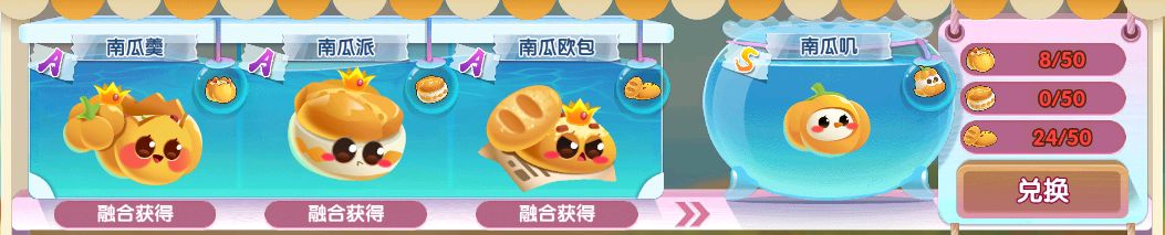 由A级南瓜籽、南瓜苗、南瓜花融合升阶将获得下一阶段A级白南瓜、金南瓜、红南瓜萌鱼,再将三只同等级的萌鱼培养至可升阶状态并进行融合升阶,以此类推得到下一阶段的A级南瓜羹、南瓜派、南瓜欧包。