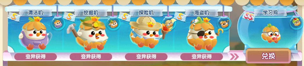 南瓜叽进行变异可获得S级清洁叽、挖掘叽、探险叽、海盗叽,接着就能兑换出SS级学习鸡萌鱼~