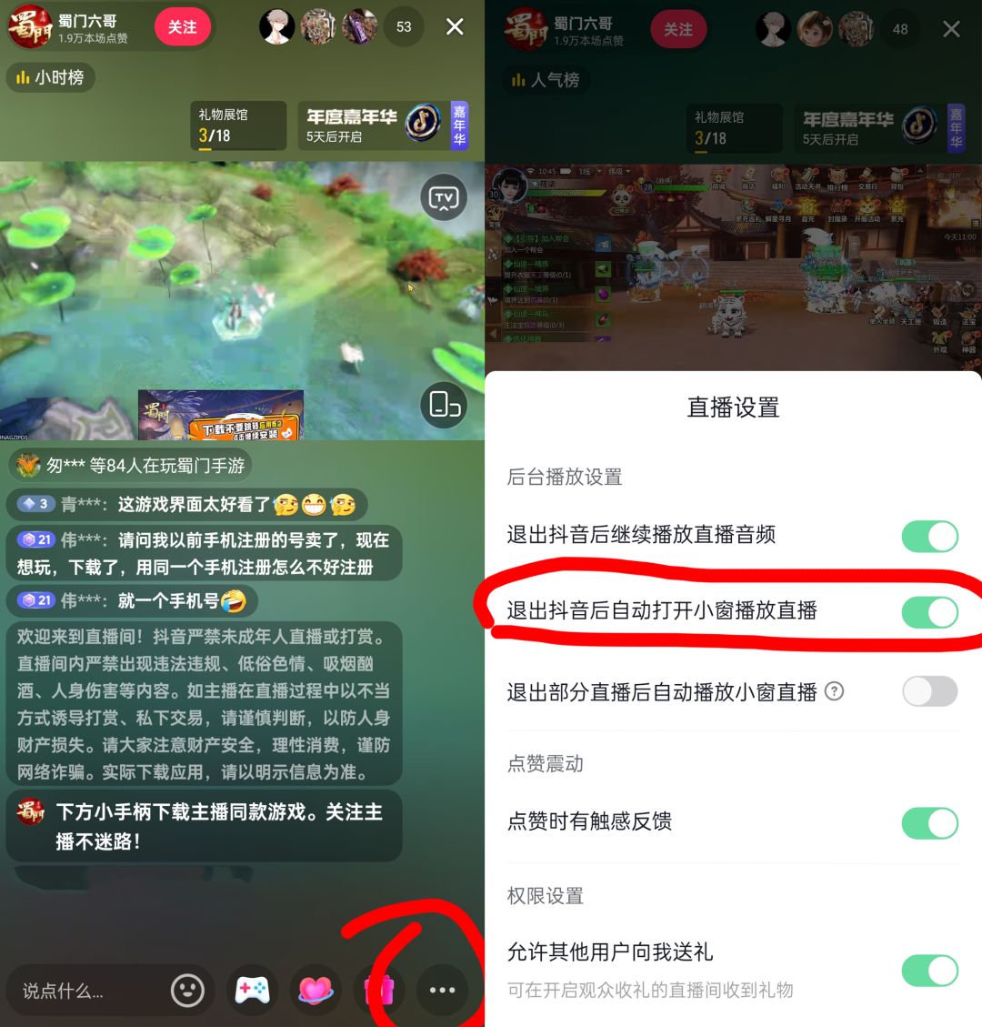 2、点击直播右下角的“...”,弹出设置后选择打开“退出抖音后自动打开小窗播放直播”