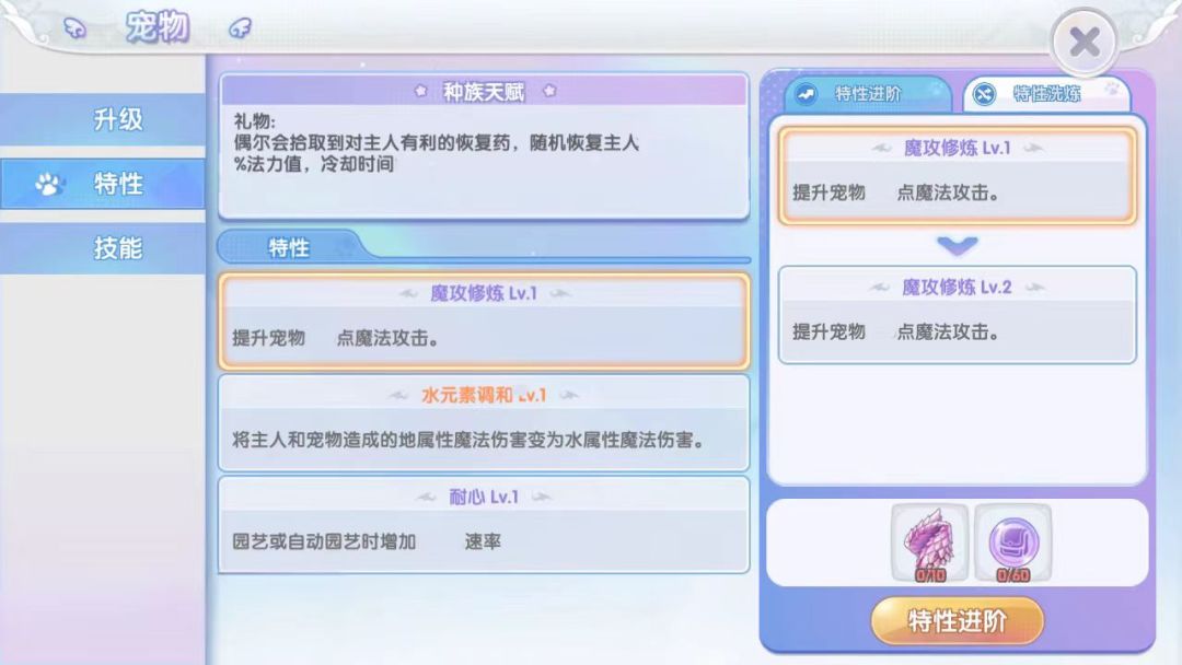 为了最大化宠物特性的潜力,冒险者可通过【特性进阶】和【特性洗炼】两种方式进行培养,以增强宠物特性的效果,完成特性的养成。