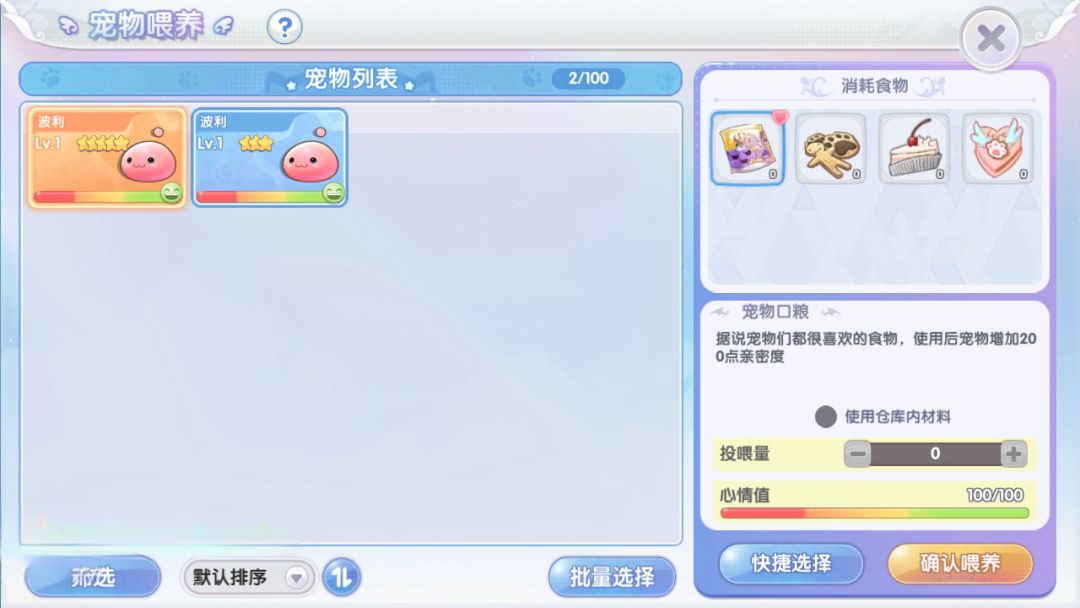 快捷选择与批量喂养功能,还能让喂养过程更加便捷高效。快捷选择能快速选择喂养宠物的食物,批量喂养会根据选择的顺序喂养玩家选择的宠物。