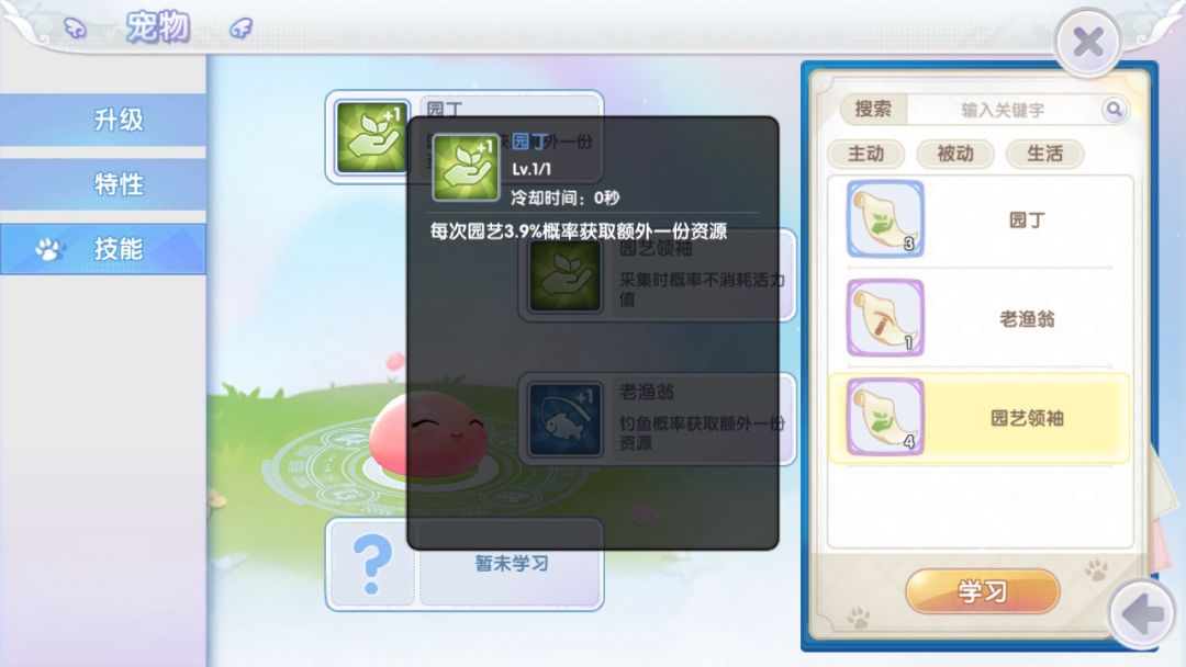 获得技能书后,冒险者可在宠物技能界面内搜索查看,并选择希望学习的技能书,进行学习解锁。技能详细信息,可通过点击学习界面内的技能图标进行确认。
