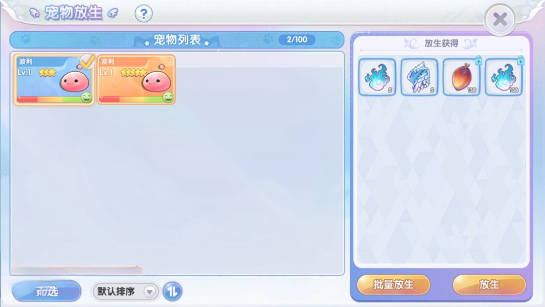放生宠物时,将会根据宠物品质与等级,返还相应的宠物养成材料。但锁定的宠物需要解除锁定状态再放生,而工作中的宠物则需要解除工作状态再放生。
