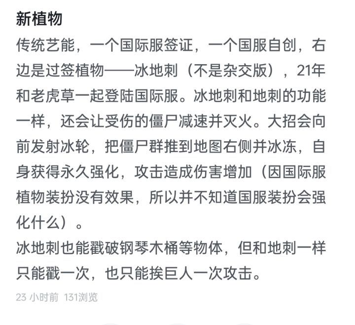 中文版下次过签的植物是冰地刺,上次简单给大家介绍了一下,结果官方动态和演示很明显把冰刺加强了