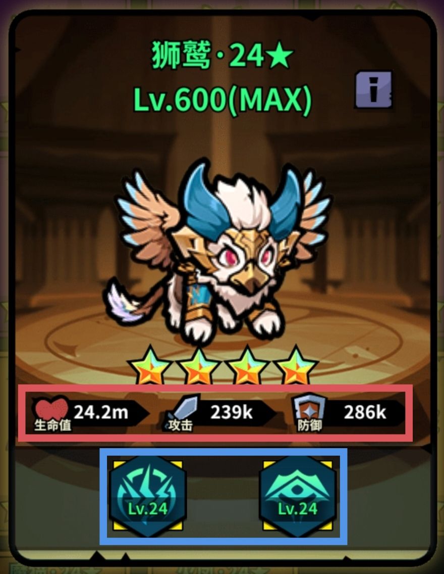 宠物对英雄的提升主要来自两个方面。一是基础属性(红框),二是宠物技能(蓝框)。