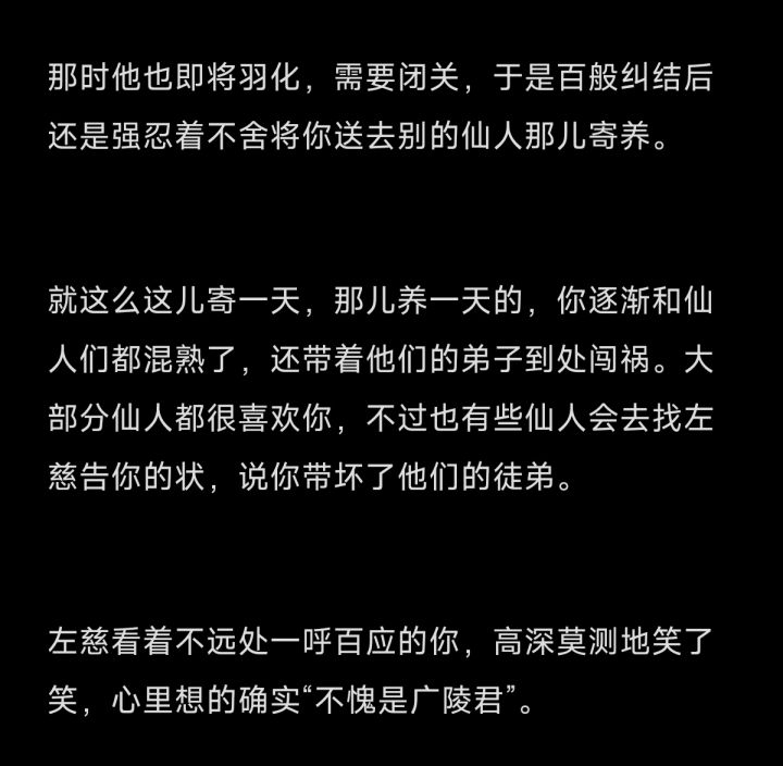 你刚到隐鸢阁时,左慈还不大懂该如何养育一个孩子。一开始好多人告诉他,不要过分溺爱小孩。可一段时间后,他再扫一眼当初说这话的仙人们,好像随便哪一个都比他更懂怎么溺爱你。