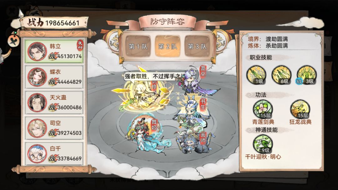 第三队就没有什么特别大的一个说法,就是把剩下的弟子组成一队,卫寒、龙人、三七、李清圣这些,如果前面2个队伍都输掉,才会有机会去用第三套嘛。