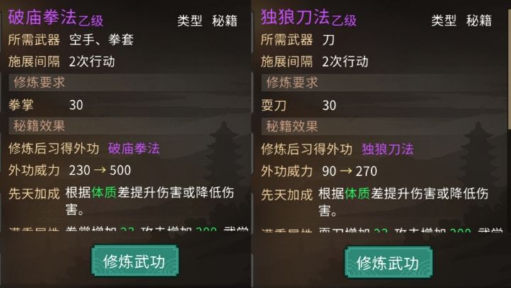 (1)选的拳,刷武功等级,市井拳法+吹风掌法+花拳绣腿(花四娘入队送)+降霜拳法(跟着老头任务走会送)+朱砂掌法(落魄江湖人易物),把拳脚精通刷到30,去破庙坐垫上触发剧情获得破庙拳法。去楚襄城。