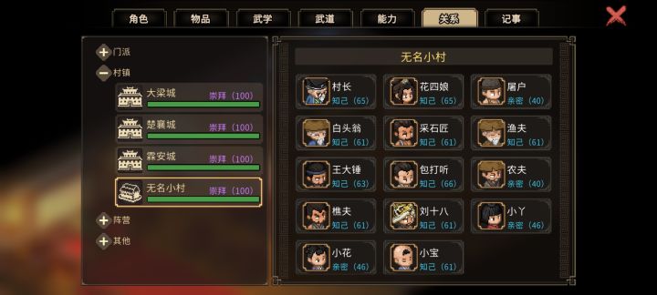 能学艺的送到好感60,无法学艺的送到40刚好使无名村关系达到崇拜,对话村长会告诉你秘密,就是村长卧室里罐子(战斗状态下打碎)下有密道,里面有牛兽环和四个需要用白玉钥匙开的箱子(村长床上有一把,直接拿)。