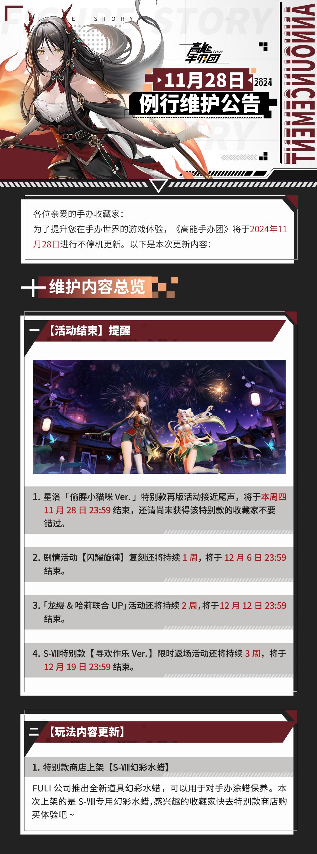 各位亲爱的手办收藏家:为了提升您在手办世界中的游戏体验,《高能手办团》将于2024年11月28日进行例行维护。详细公告内容请点击下方图片查看