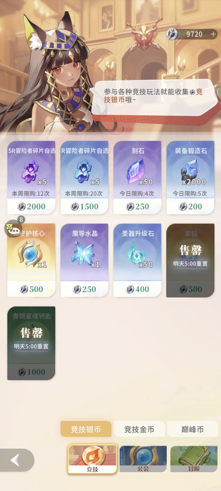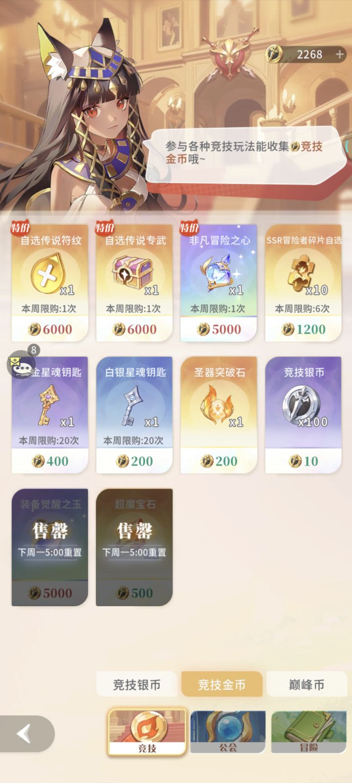 2.竞技金币,非凡之心、ssr冒险者碎片自选、装备觉醒之玉是前期必买的,后期钥匙和超魔宝石会越来越重要,所以建议有能力小伙伴这些最好都能买下,金币肯定是不够的,可以用巅峰币换。